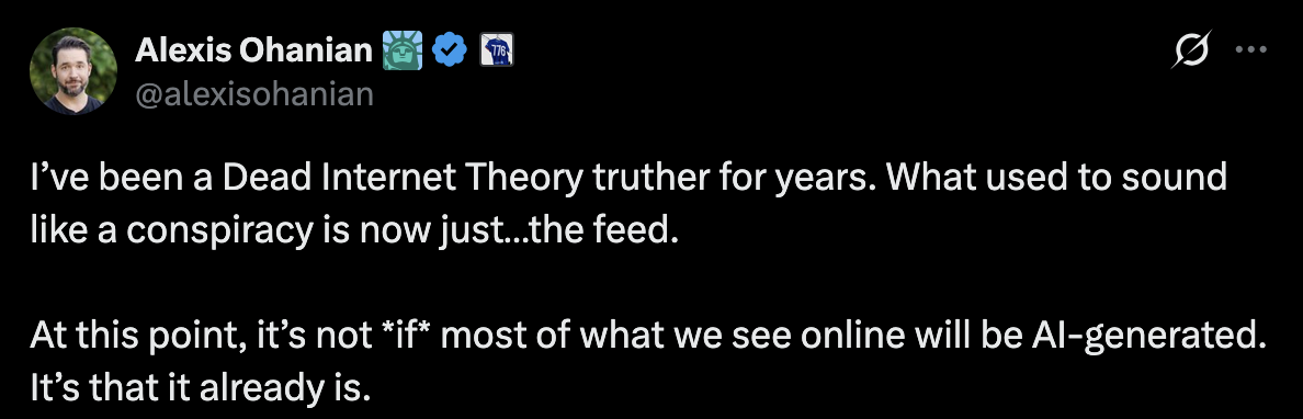 “I’ve been a Dead Internet Theory truther for years. What used to sound like a conspiracy is now just…the feed. At this point, it’s not *if* most of what we see online will be AI-generated. It’s that it already is,” tweeted Alexis Ohanian, co-founder of Reddit on June 8. Reddit, the self-proclaimed “Heart of the Internet” and social media message board has over 443 million active weekly users. Earlier this year, a cybersecurity firm called Imperva reported that 51% of all internet traffic in 2024 was generated by robots. I wonder how many of them use Reddit?
