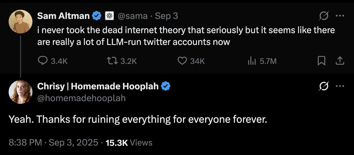 “i (sic) never took the dead internet theory that seriously but it seems like there are really a lot of LLM-run twitter accounts now,” tweeted Sam Altman, CEO of OpenAI (makers of ChatGPT), on Sept. 3 of this year. “Yeah. Thanks for ruining everything for everyone forever,” replied one user.