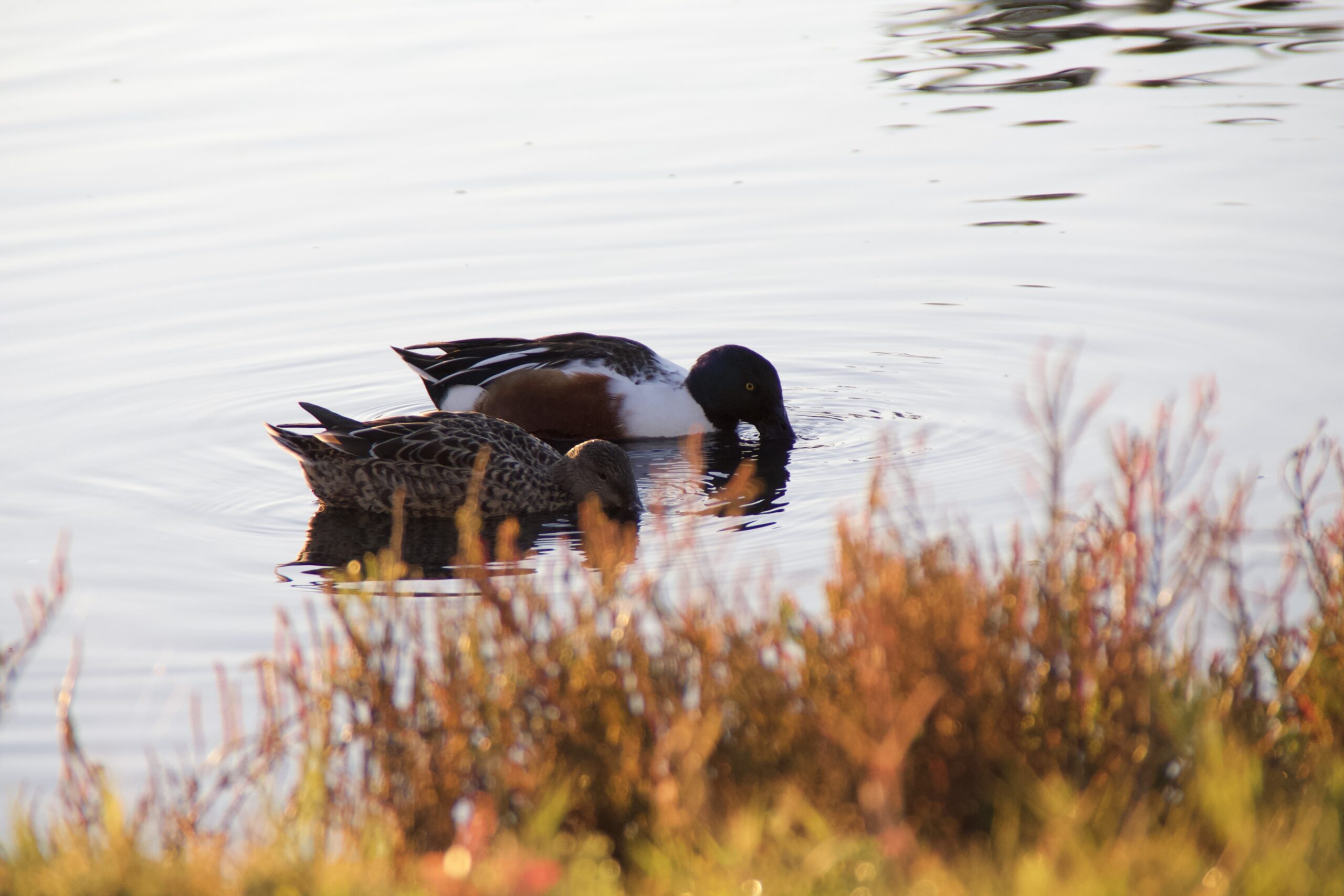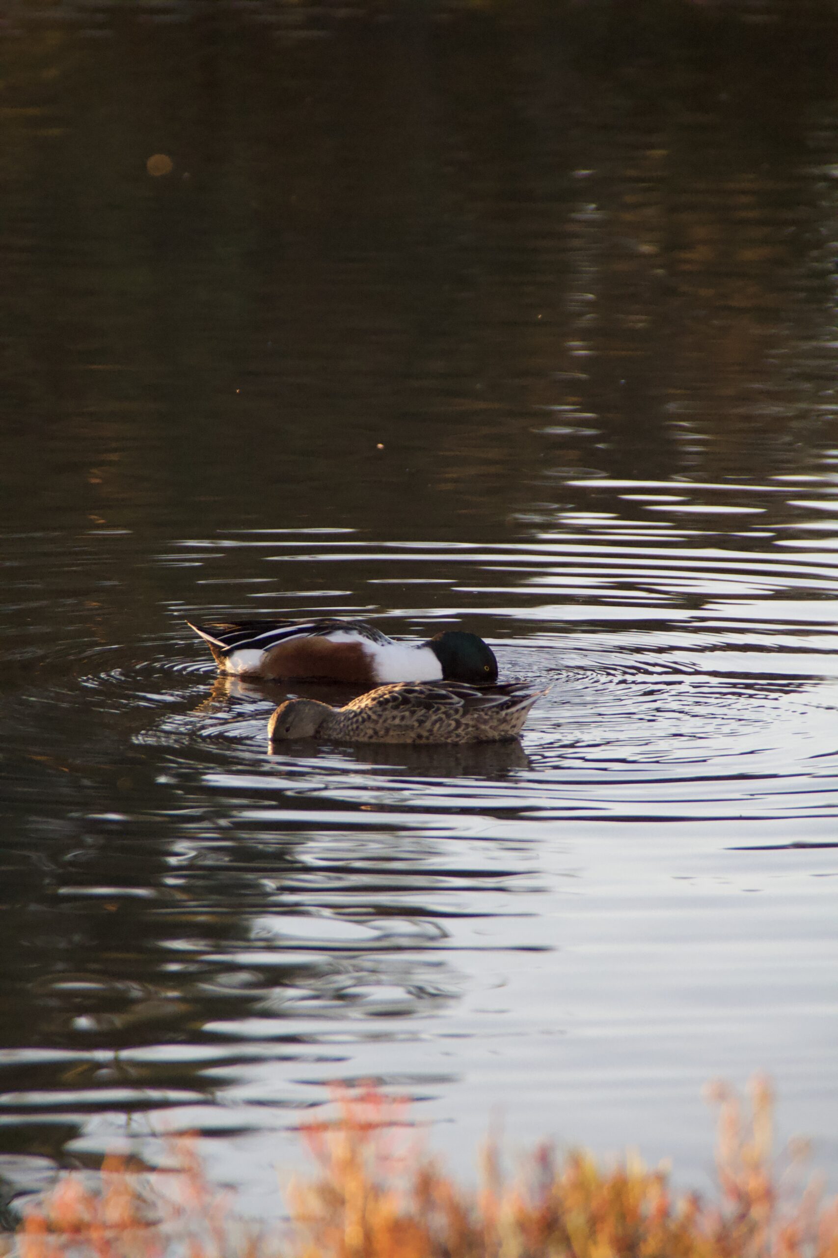 By: A male and female pair of Northern Shoveler ducks searching for food in the water